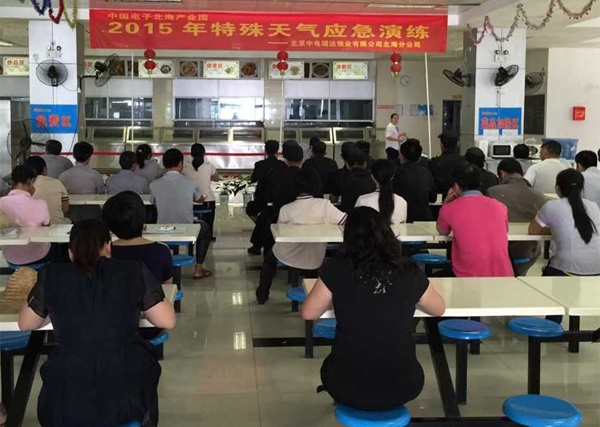 因北海天氣多變,特殊天氣隨時可能發(fā)生,為防止隨時可能出現(xiàn)的特殊天氣對園區(qū)安全帶來不利影響,確保園區(qū)設備財產(chǎn)的正常運轉(zhuǎn)、安全,確保園區(qū)安全生產(chǎn)零事故,同時為讓員工熟悉應對特殊天氣的工作流程,做到工作有計劃性、準備工作及時到位、突發(fā)事件處理及時,園區(qū)物業(yè)公司(中電瑞達)于2015年6月9日下午,組織公司全體人員開展了一次特殊天氣應急演練。整個演練分為:特殊天氣應急預案培訓、特殊天氣應急演練兩大部分。為確保此次演練順利進行,物業(yè)公司積極準備,專門組織各部門負責人召開專題會議,完善方案、物資準備,部署每個演練環(huán)節(jié),明確人員分工、時間節(jié)點、演練流程。