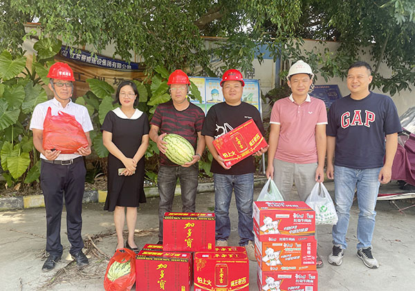 2023年7月19日下午,園區(qū)項目中電春海湖、中電海灣國際建設(shè)現(xiàn)場烈日炎炎,受集團(tuán)公司領(lǐng)導(dǎo)的委托,中國電子北海產(chǎn)業(yè)園公司副總經(jīng)理劉曉娟到項目建設(shè)現(xiàn)場,為高溫天氣下堅守在一線的工作者送去了清涼和慰問,囑咐大家在高溫天氣下工作要做好防暑降溫措施,合理安排工作時間。